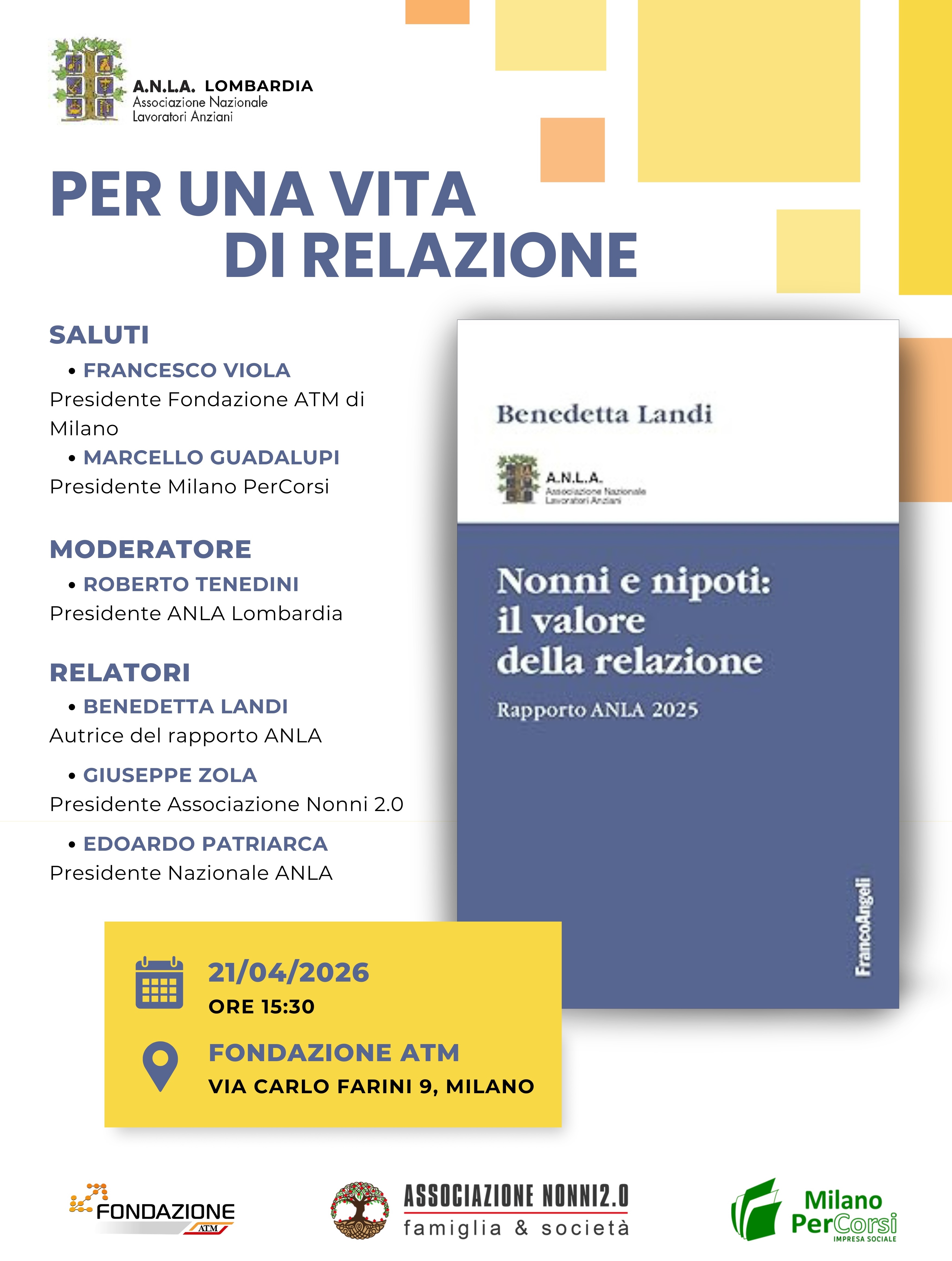 A Milano, il 21 aprile 2026 alle 15.30 nella sede della Fondazione ATM di Milano in via Carlo Farini 9 verrà organizzata da ANLA Lombardia una nuova presentazione del Rapporto ANLA 2025 "Nonni e nipoti, il valore della relazione". L'incontro ha lo scopo di presentare la ricerca attraverso l'ascolto di chi ha redatto il rapporto e la testimonianza di chi nel territorio milanese opera per costruire una presenza attiva dei nonni.